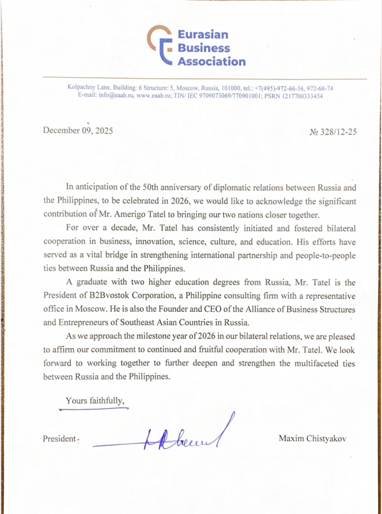 We are honored to share yet another formal Letter of Gratitude, this time from the Eurasian Business Association, recognizing Mr. Amerigo Tatel for his consistent efforts in strengthening international partnership and people-to-people ties between Russia and the Philippines. The letter highlights his role and contribution in advancing business, innovation, cultural, scientific, and educational exchanges.